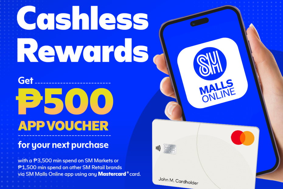 - Mastercard cardholder who make a purchase on SM Malls Online App of at least ₱1,500 worth from participating SM Retail Affiliates or P3,500 minimum spend from SM Markets will earn a reward of ₱500 SM Malls Online app credits using any Mastercard credit card (local or international).